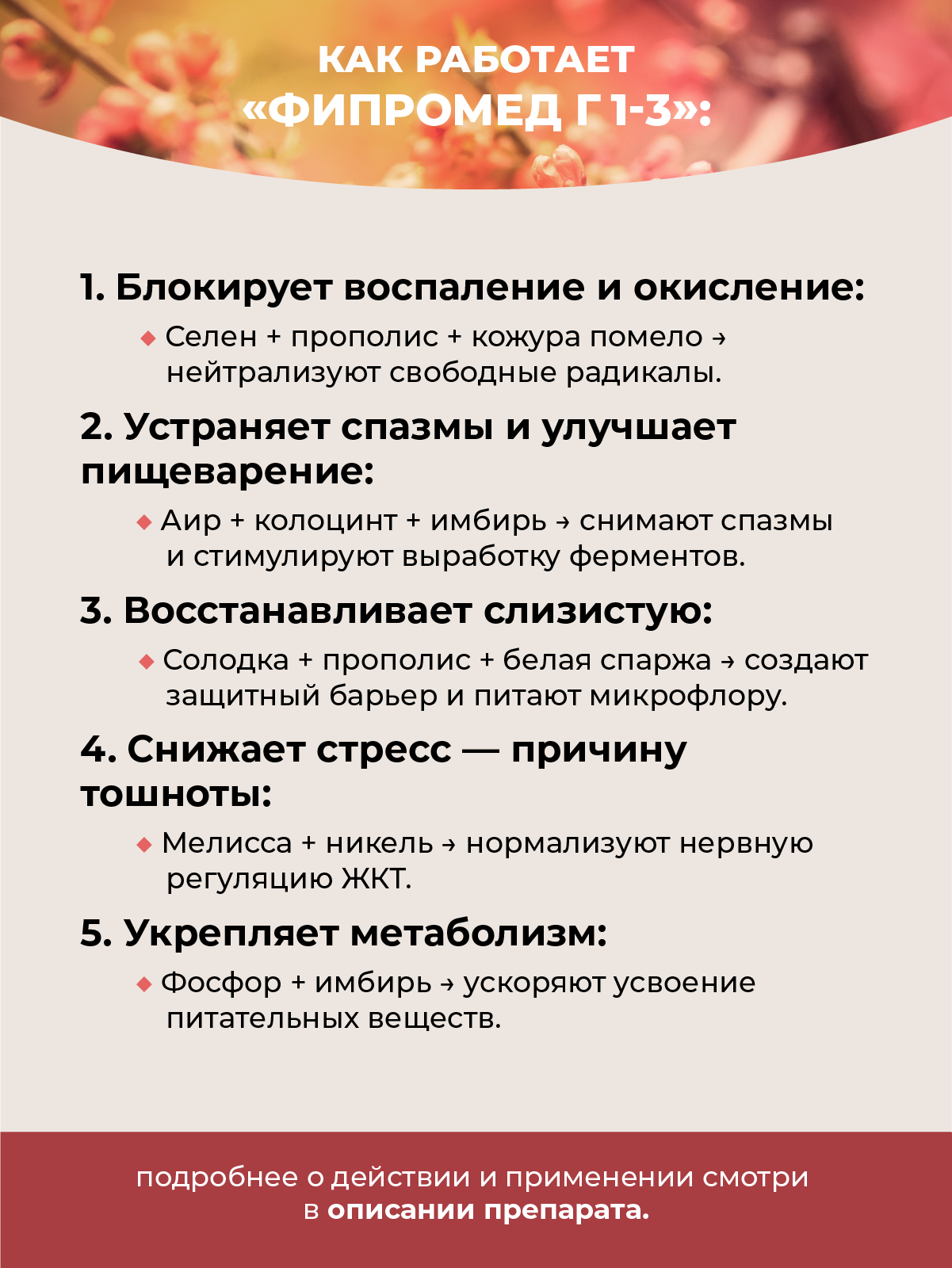 Солодка + прополис + белая спаржа → создают защитный барьер, питают микрофлору. - Снижает стресс — причину тошноты