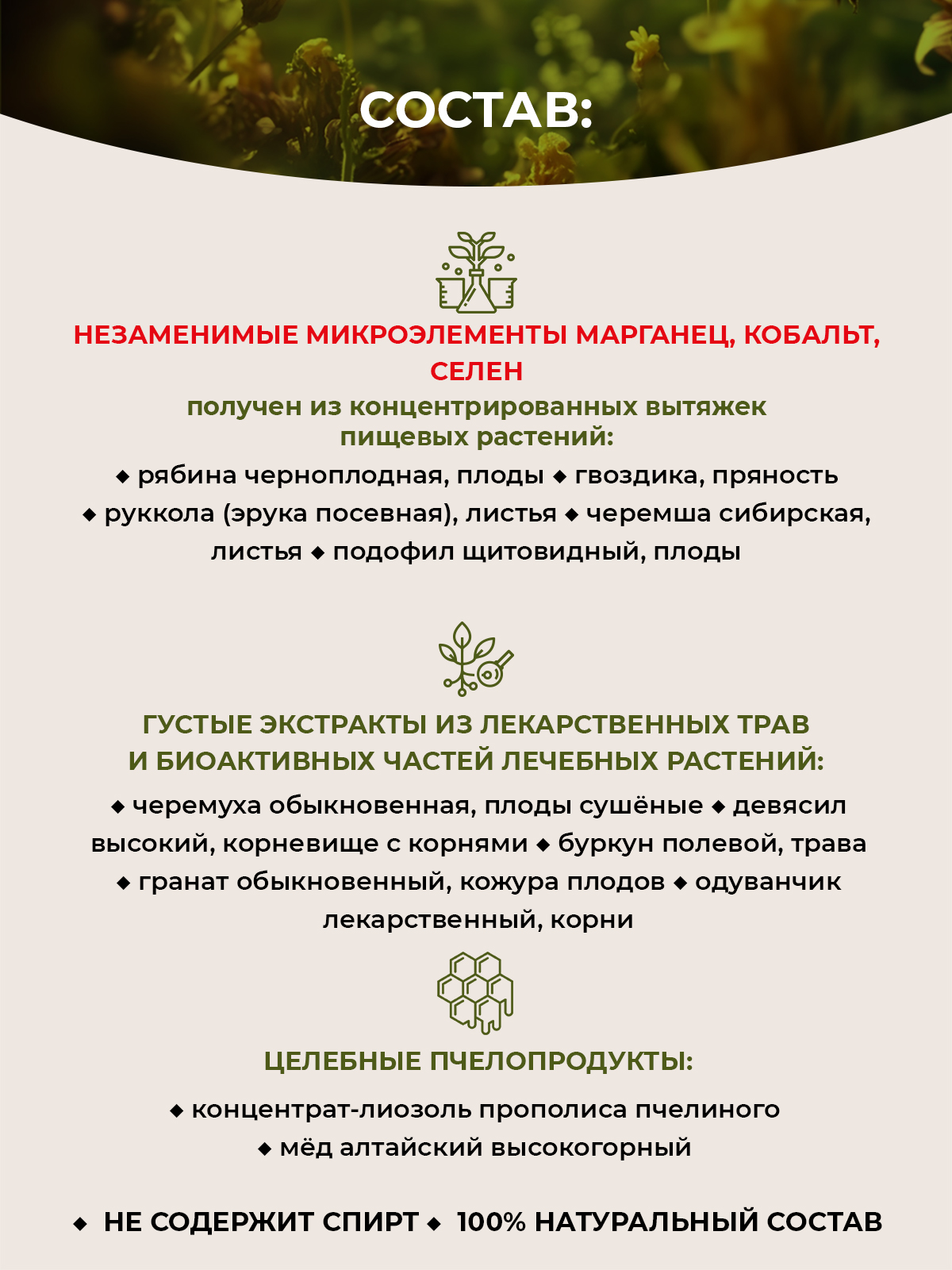 • 100% натуральный состав — никакой «химии», только экстракты трав и пчелопродукты.