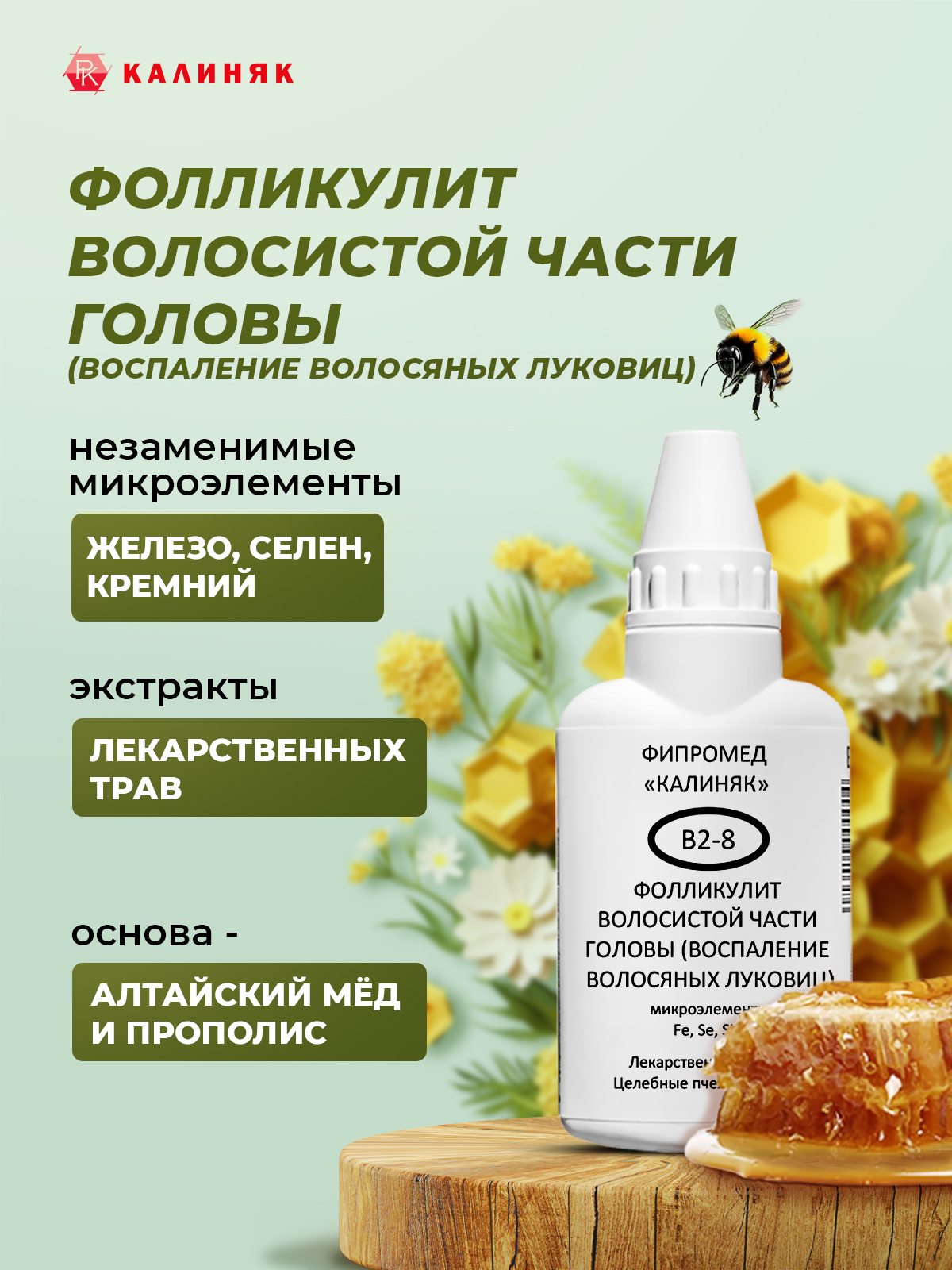 ФИПРОМЕД КАЛИНЯК В2-8 — ваш надёжный помощник в борьбе с воспалением волосяных луковиц. Препарат устраняет очаги инфекции, успокаивает раздражённую кожу и восстанавливает естественный баланс. Натуральные компоненты и синергия с В2-8А — ваш путь к здоровым фолликулам!