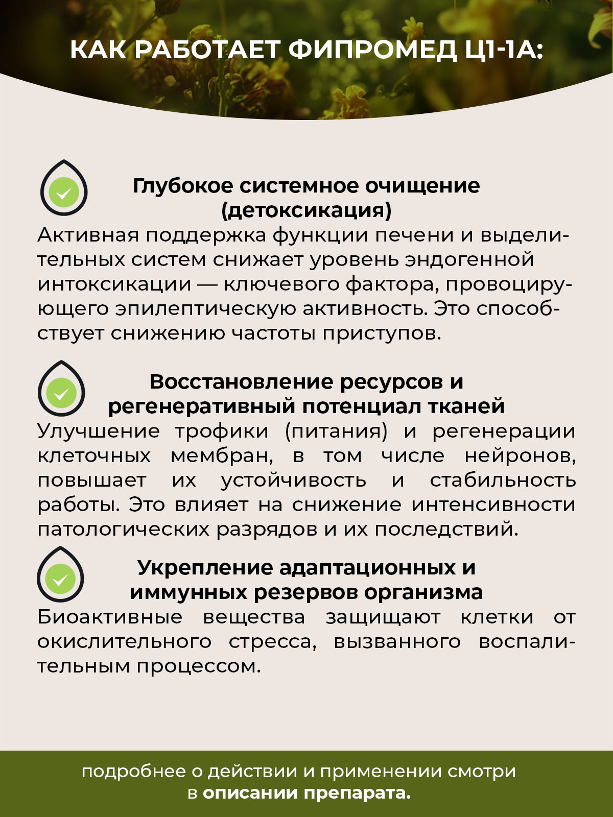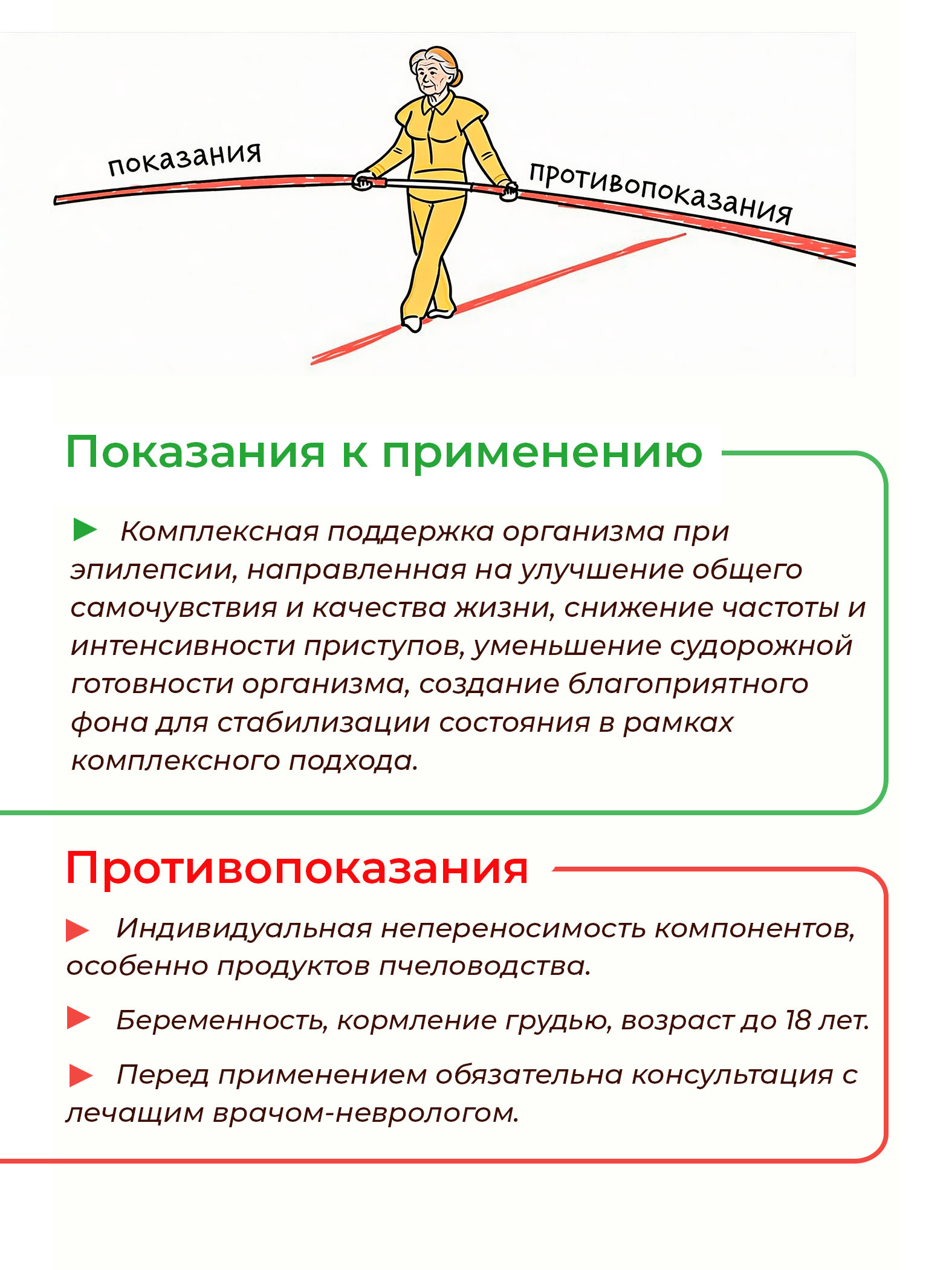 Длительное течение эпилепсии ведёт к истощению ресурсов организма и повышенной токсической нагрузке, что косвенно влияет на стабильность нервной системы и провоцирует приступы. Повышенная нагрузка ложится на системы детоксикации (печень), иммунную защиту и обмен веществ. Данный комплекс предназначен для многоуровневой поддержки, направленной на создание условий для сокращения частоты приступов, снижения интенсивности их проявления и судорожной готовности организма. Он не заменяет основного лечения.