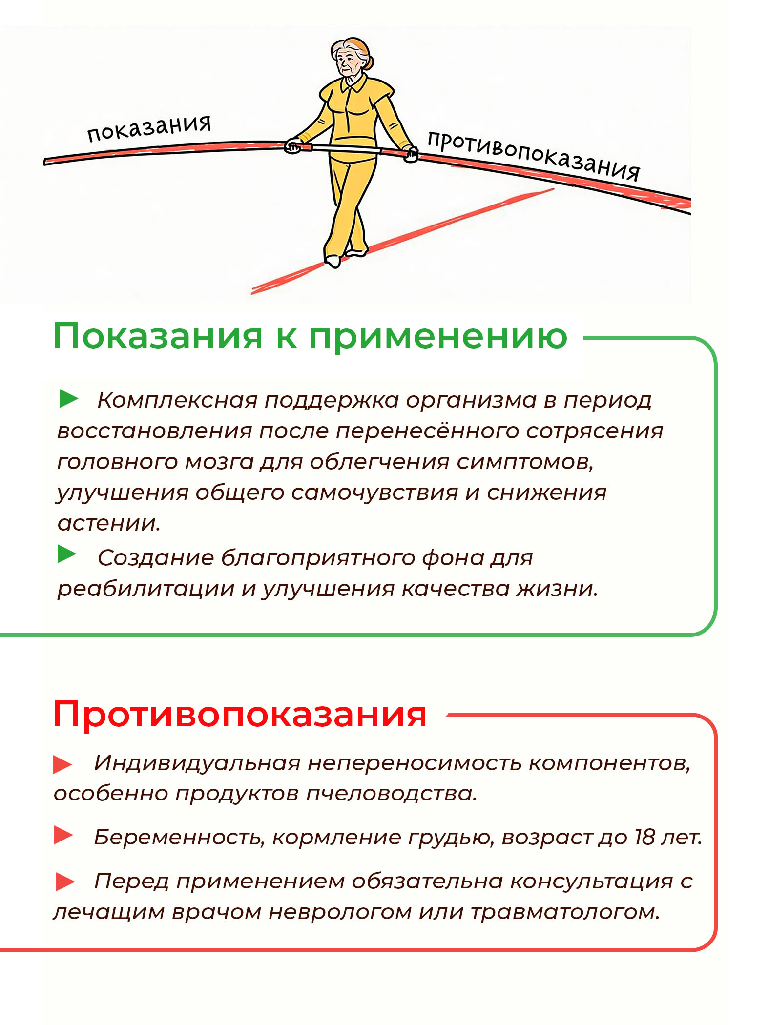 → Комплексная поддержка организма в период восстановления после перенесённого сотрясения головного мозга, направленная на облегчение симптомов (головной боли, головокружения, астении), улучшение общего самочувствия, стабилизацию эмоционального фона, нормализацию сна, усиление процессов детоксикации, улучшение мозгового кровообращения и создание оптимальных условий для полноценного восстановления нервной системы.