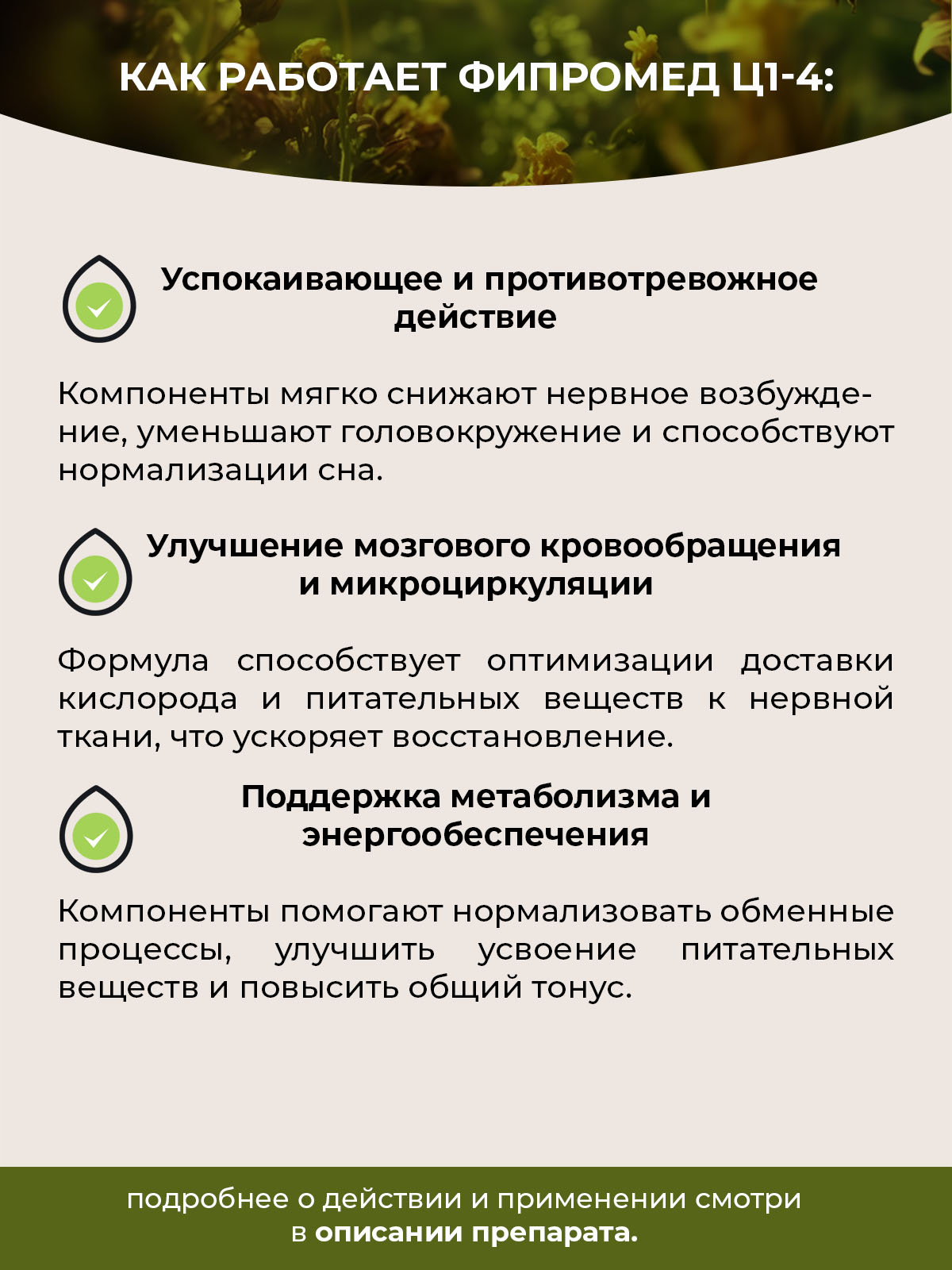2. Восстановление баланса нейромедиаторов и проводимости. Активные вещества мягко корректируют баланс процессов возбуждения и торможения в ЦНС, помогая справиться с головокружением, тошнотой и когнитивной заторможенностью.