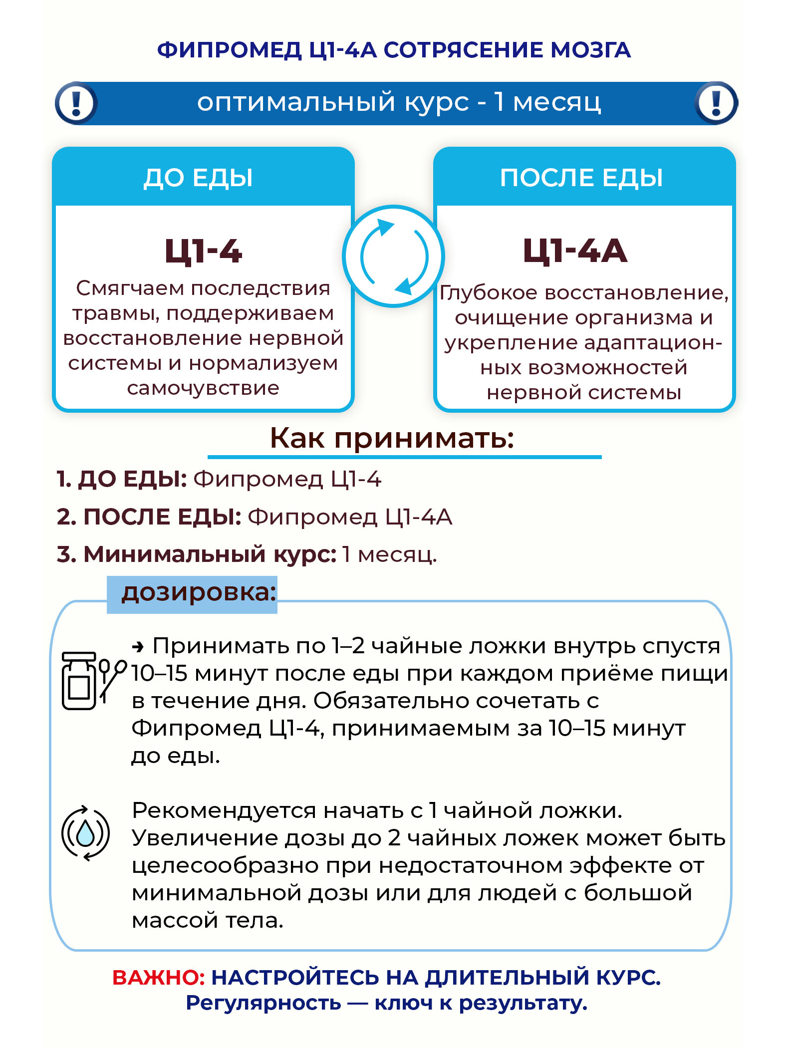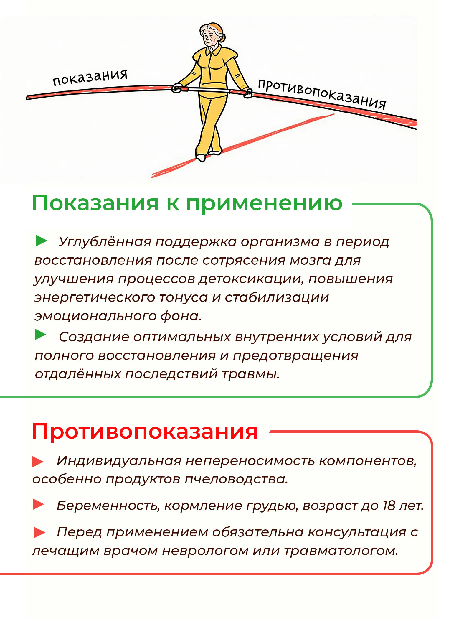 Даже после стихания острых симптомов сотрясения мозга, организм продолжает нуждаться в поддержке. Последствия травмы могут проявляться в виде астении, снижения работоспособности, ухудшения памяти и эмоциональной нестабильности. Для полноценного восстановления необходимо не только защитить нейроны, но и очистить организм от продуктов распада, восполнить дефицит микроэлементов и укрепить адаптационные механизмы. Данный комплекс предназначен для глубокой поддержки организма на этапе восстановления после сотрясения мозга, направленной на очищение, регенерацию и восполнение энергетических ресурсов. Он не заменяет основного лечения.