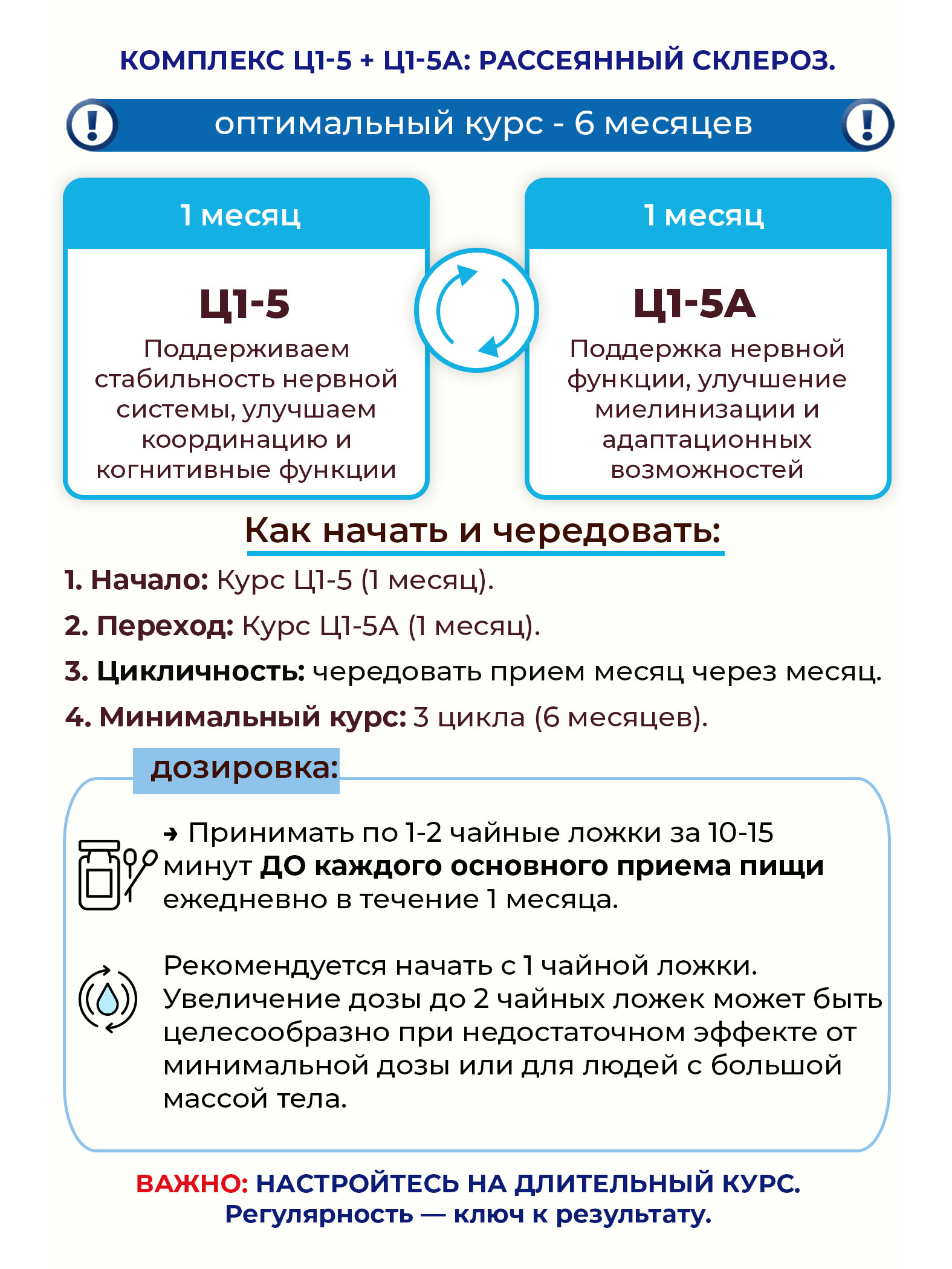 После завершения месячного курса Ц1-5 следует перейти на приём препарата Фипромед Ц1-5А Рассеянный склероз. Стабилизация психомоторики также на 1 месяц. Для достижения устойчивого результата рекомендуется циклическое чередование этих двух препаратов по схеме «месяц через месяц». Минимальная рекомендуемая продолжительность — 3 двухмесячных цикла (6 месяцев).