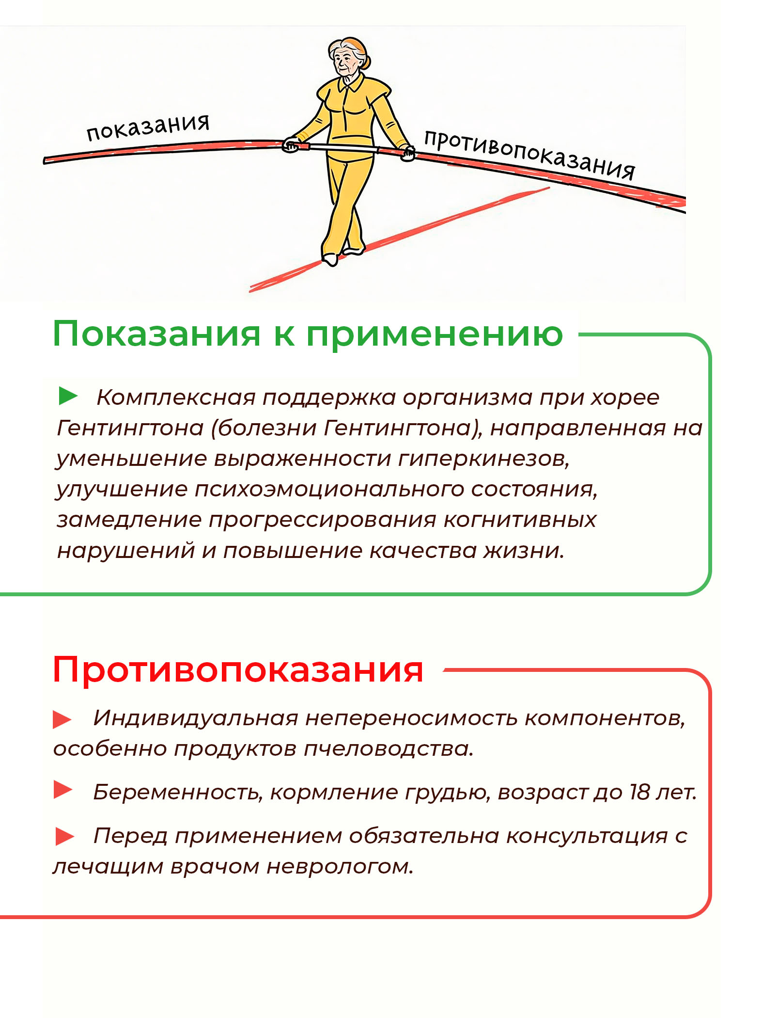 → Комплексная поддержка организма при хорее Гентингтона (болезни Гентингтона), направленная на уменьшение выраженности гиперкинезов, улучшение психоэмоционального состояния, замедление прогрессирования когнитивных нарушений и повышение качества жизни.