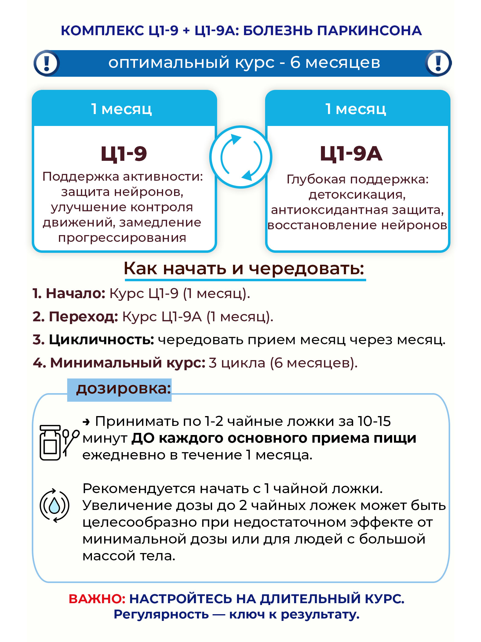 После завершения месячного курса Ц1-9 следует перейти на приём препарата Фипромед Ц1-9А Болезнь Паркинсона также на 1 месяц. Для достижения устойчивого результата рекомендуется циклическое чередование этих двух препаратов по схеме «месяц через месяц». Минимальная рекомендуемая продолжительность — 3 двухмесячных цикла (6 месяцев).