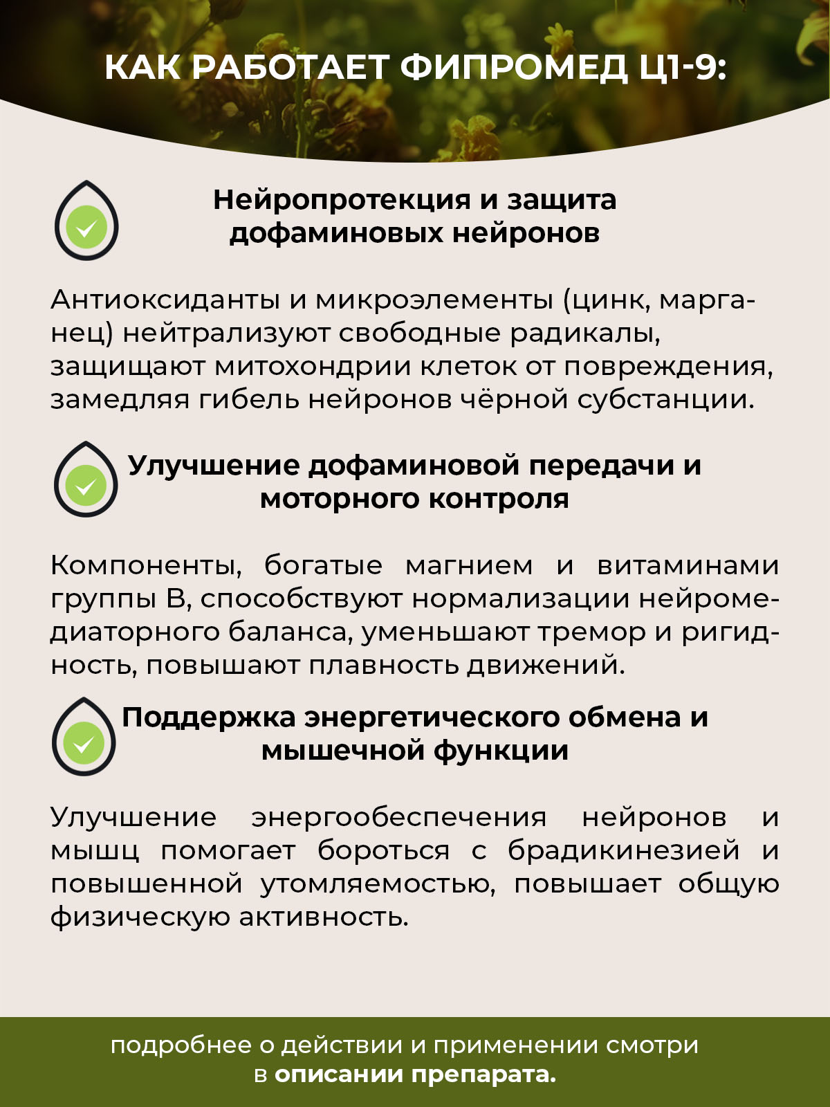 Препарат обеспечивает комплексную поддержку ключевых систем, страдающих при болезни Паркинсона: нервной, антиоксидантной и энергетического обмена. Работа формулы направлена на достижение трёх взаимосвязанных целей: защита дофаминовых нейронов, улучшение двигательной активности и снижение окислительного стресса. Это реализуется через следующие механизмы: