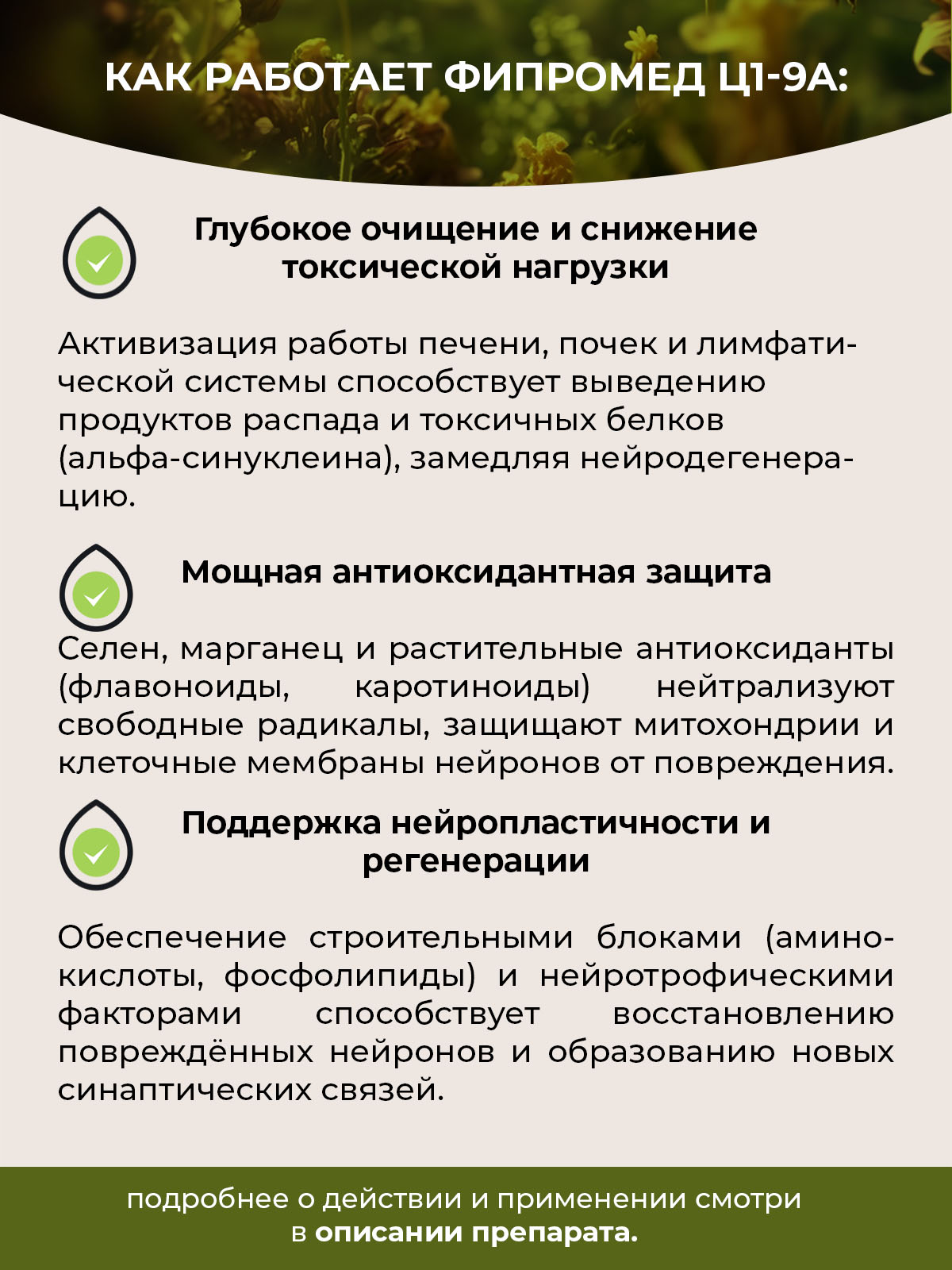 Препарат обеспечивает комплексную поддержку ключевых систем, ослабленных хроническим нейродегенеративным процессом: детоксикационной, нервной и антиоксидантной. Работа формулы направлена на достижение трёх взаимосвязанных целей: системное очищение от токсических метаболитов, защита от окислительного стресса и поддержка регенерации нейронов. Это реализуется через следующие механизмы: