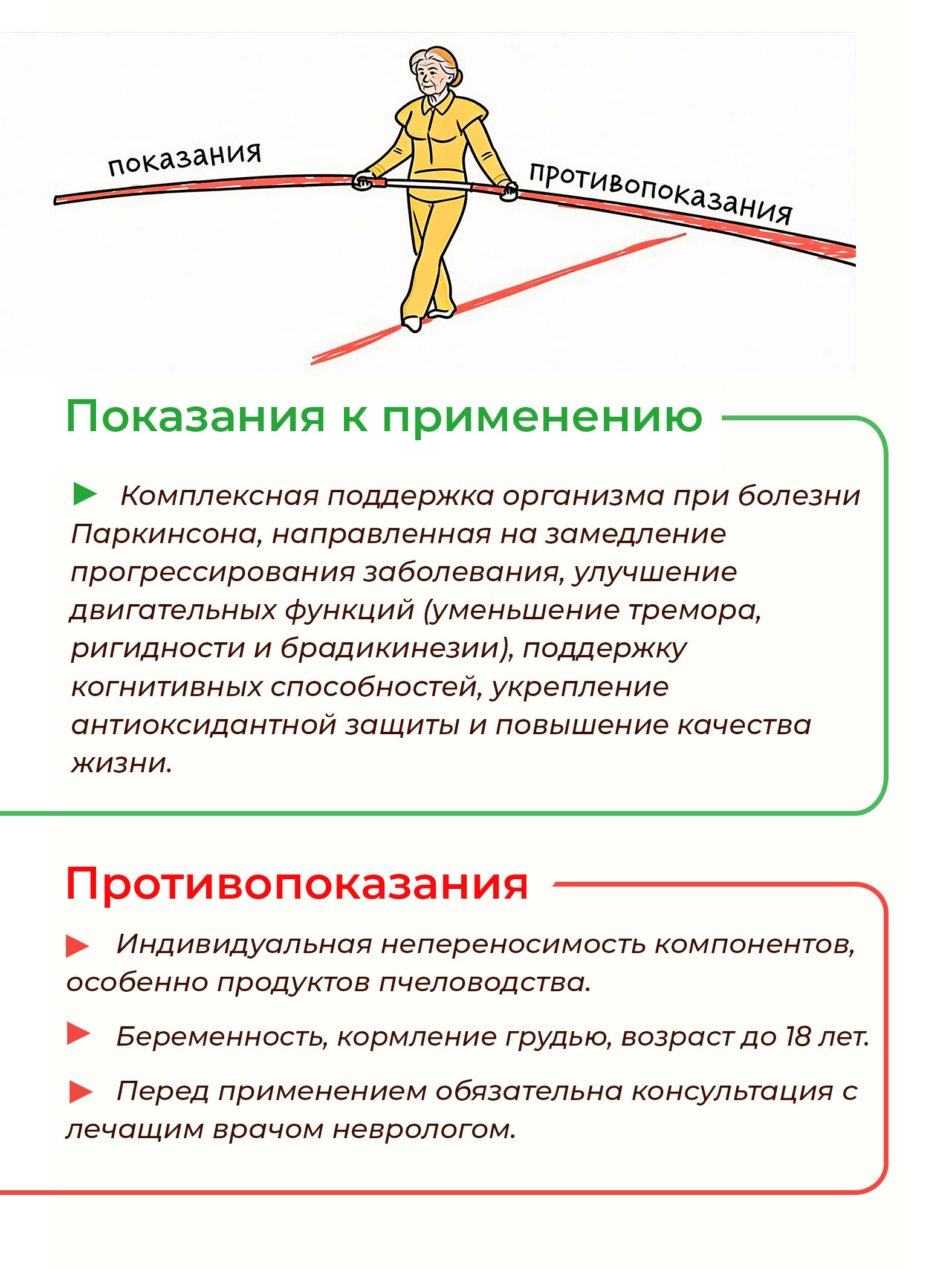 → Комплексная поддержка организма при болезни Паркинсона, направленная на замедление прогрессирования заболевания, улучшение двигательных функций (уменьшение тремора, ригидности и брадикинезии), поддержку когнитивных способностей, укрепление антиоксидантной защиты и повышение качества жизни.