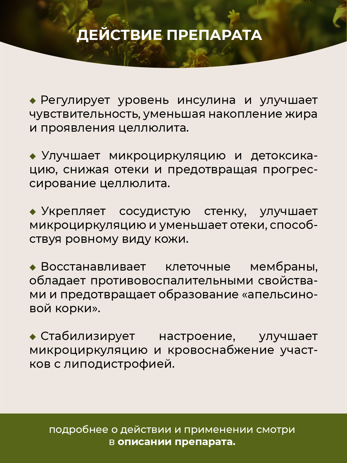 - Фосфор, Зимолюбка зонтичная и Прополис: Фосфор восстанавливает клеточные мембраны и улучшает обмен веществ, ускоряя действие зимолюбки, которая обладает противовоспалительными свойствами и улучшает микроциркуляцию, снижая отеки. Прополис, обладая антимикробными и противовоспалительными эффектами, поддерживает регенерацию клеток и усиливает действие зимолюбки. В итоге, это сочетание предотвращает адгезивное сращение поверхностных слоев кожи к строме подлежащих уровней покровных тканей тела, препятствуя образованию «апельсиновой корки».
